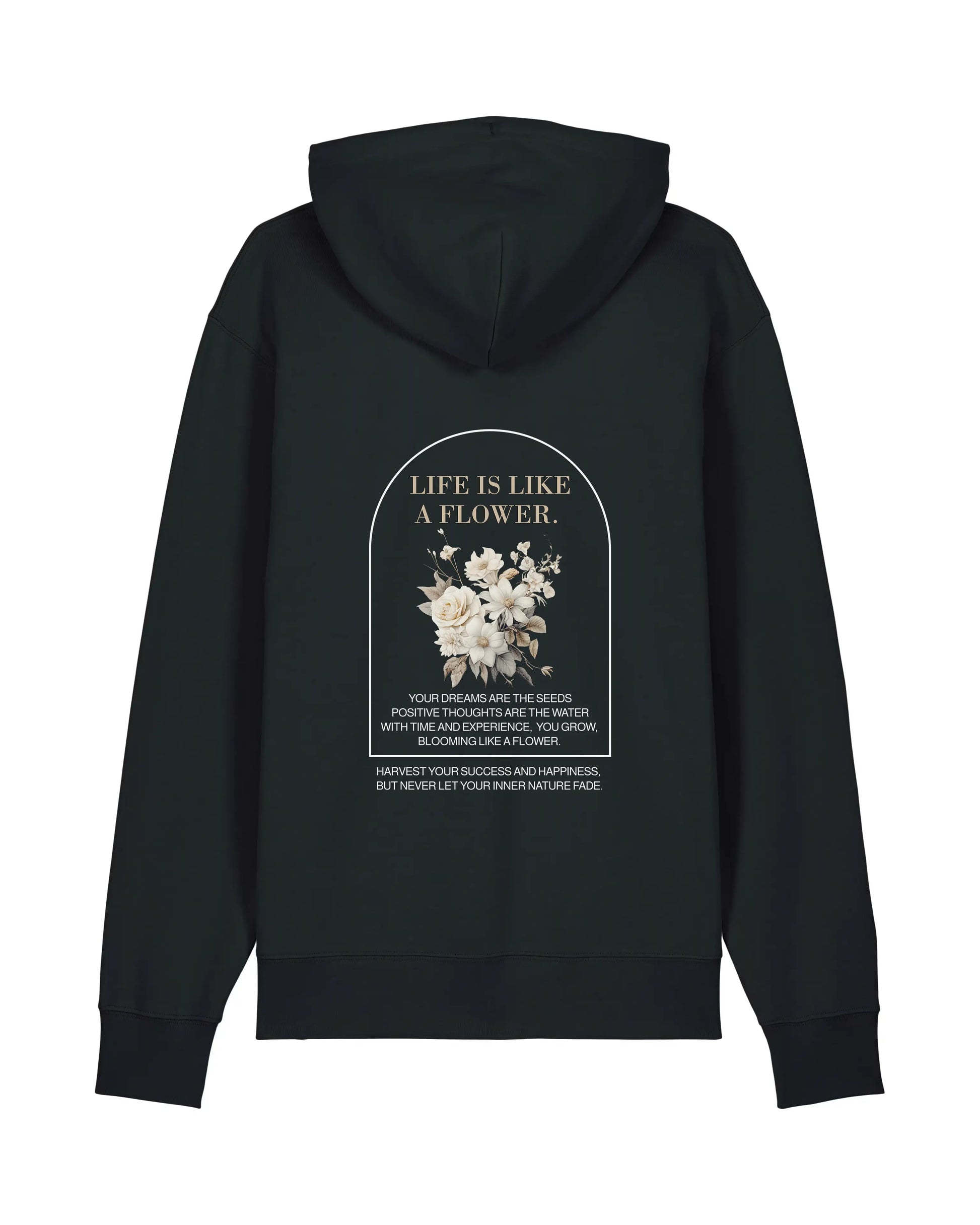 Unser „Life is like a flower“ Oversized Unisex Hoodie aus 100 % Bio-Baumwolle, vereint Komfort, Nachhaltigkeit und Achtsamkeit. Dezent vorne, ausdrucksstark hinten – ein Symbol für Wachstum, Schönheit und die Vergänglichkeit des Lebens., wer kennt es nicht? Perfekt für alle, die nachhaltige Mode mit einer tiefen Botschaft lieben.